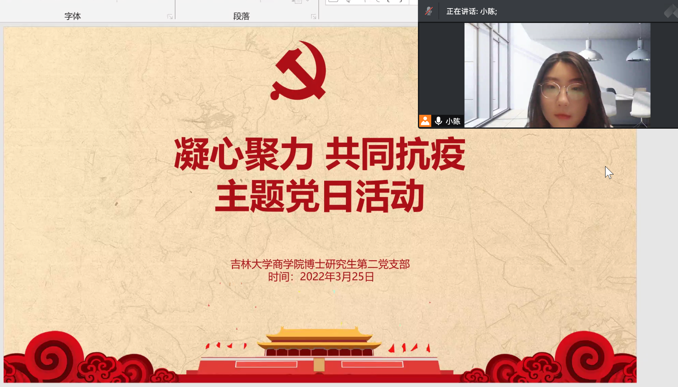 本次党日活动主要分为三个流程,首先由支部书记陈婉莹同志对3月13日封寝以来的情况与工作进行了梳理与说明,组织大家观看青春吉大视频号发布视频“伟德官网党委常务副书记冯正玉同志在‘口罩里的歌声’吉大人共战疫情线上音乐会上的致辞”,接着分别邀请志愿者同志以及校外居住人员发表体会。