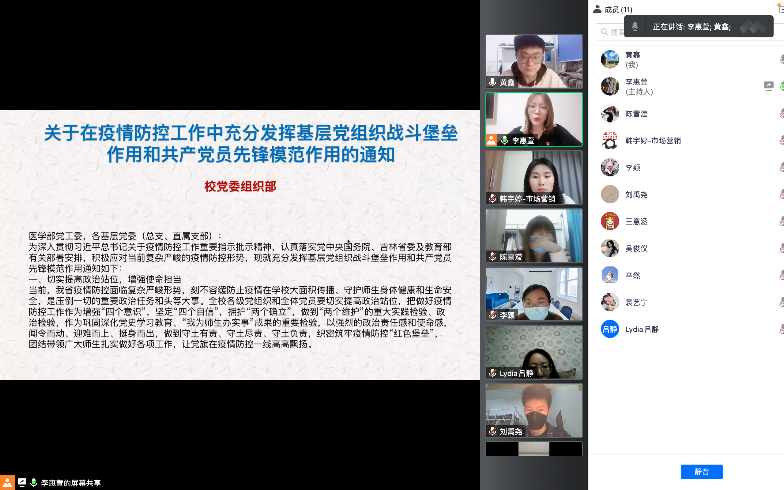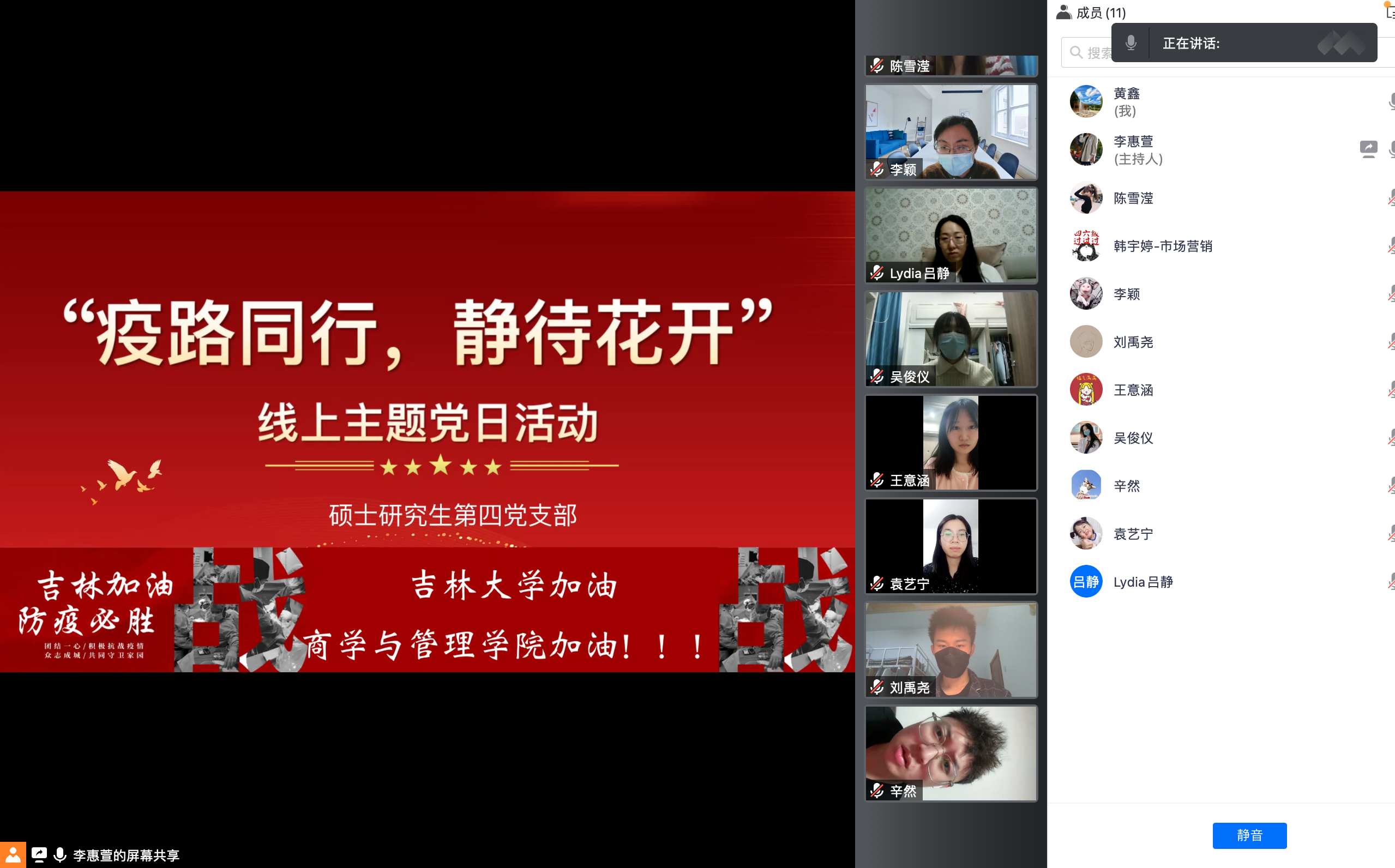 吉林省新冠肺炎疫情防控形式日益严峻,这个三月,全体吉大人以敢战必胜的勇气与决心,积极夺取疫情防控阻击战的全面胜利。为调动党员及党员干部抗疫的积极性,增强党员们带领群众打赢抗疫战的信心,伟德官网硕士研究生第四党支部于3月24日19:00,在线上腾讯会议开展了以“疫路同行 静待花开”为主题的党日活动。支部全体党员及支部参与志愿者工作的积极分子参与了此次活动。