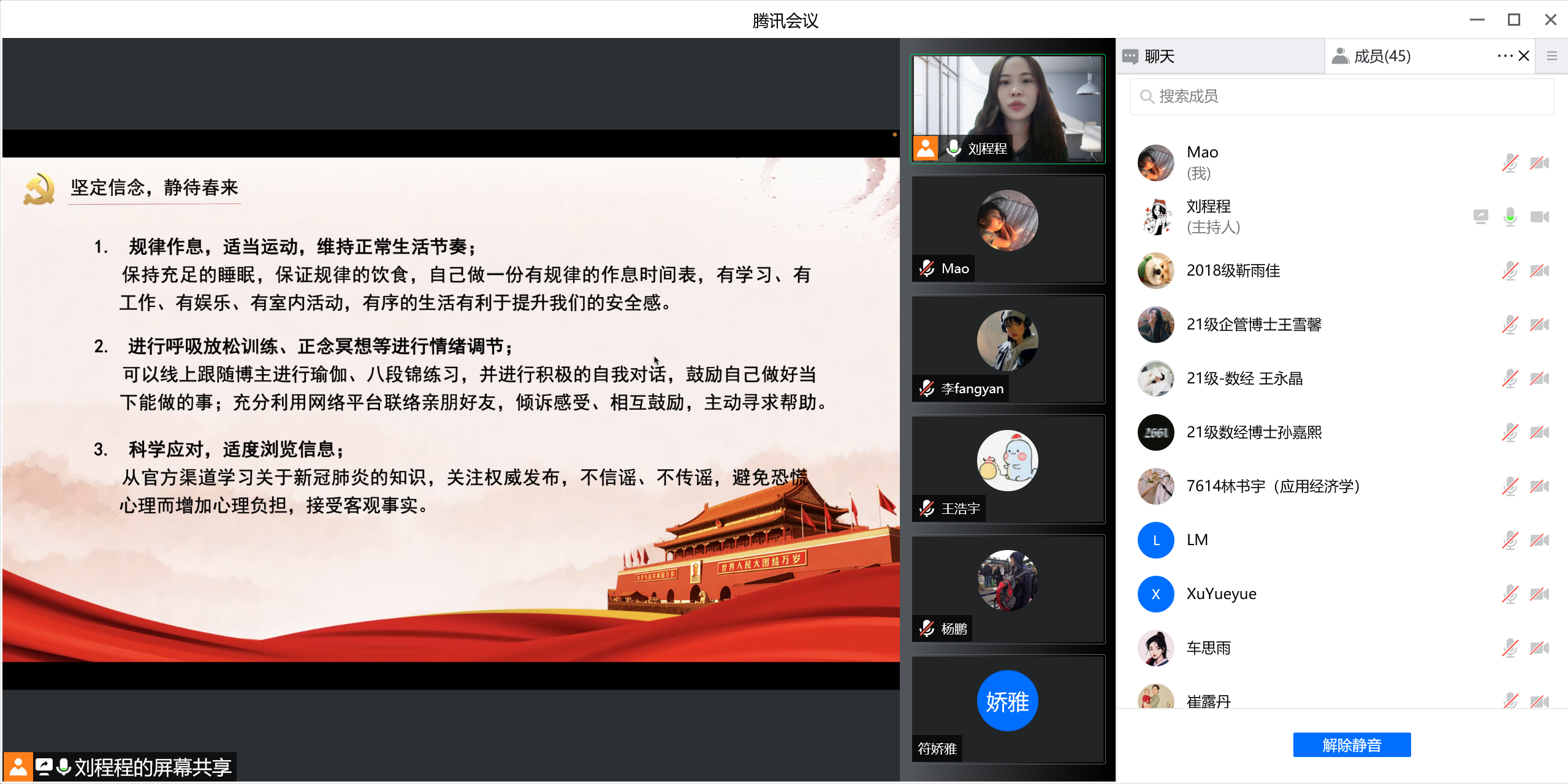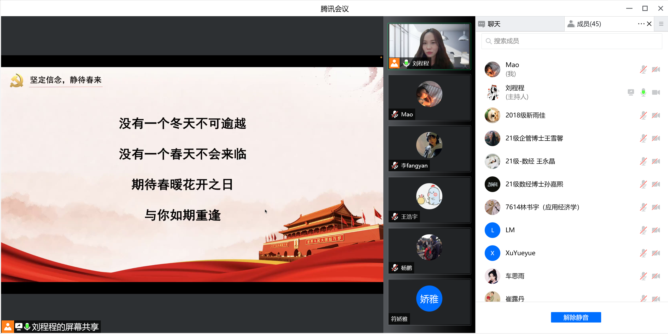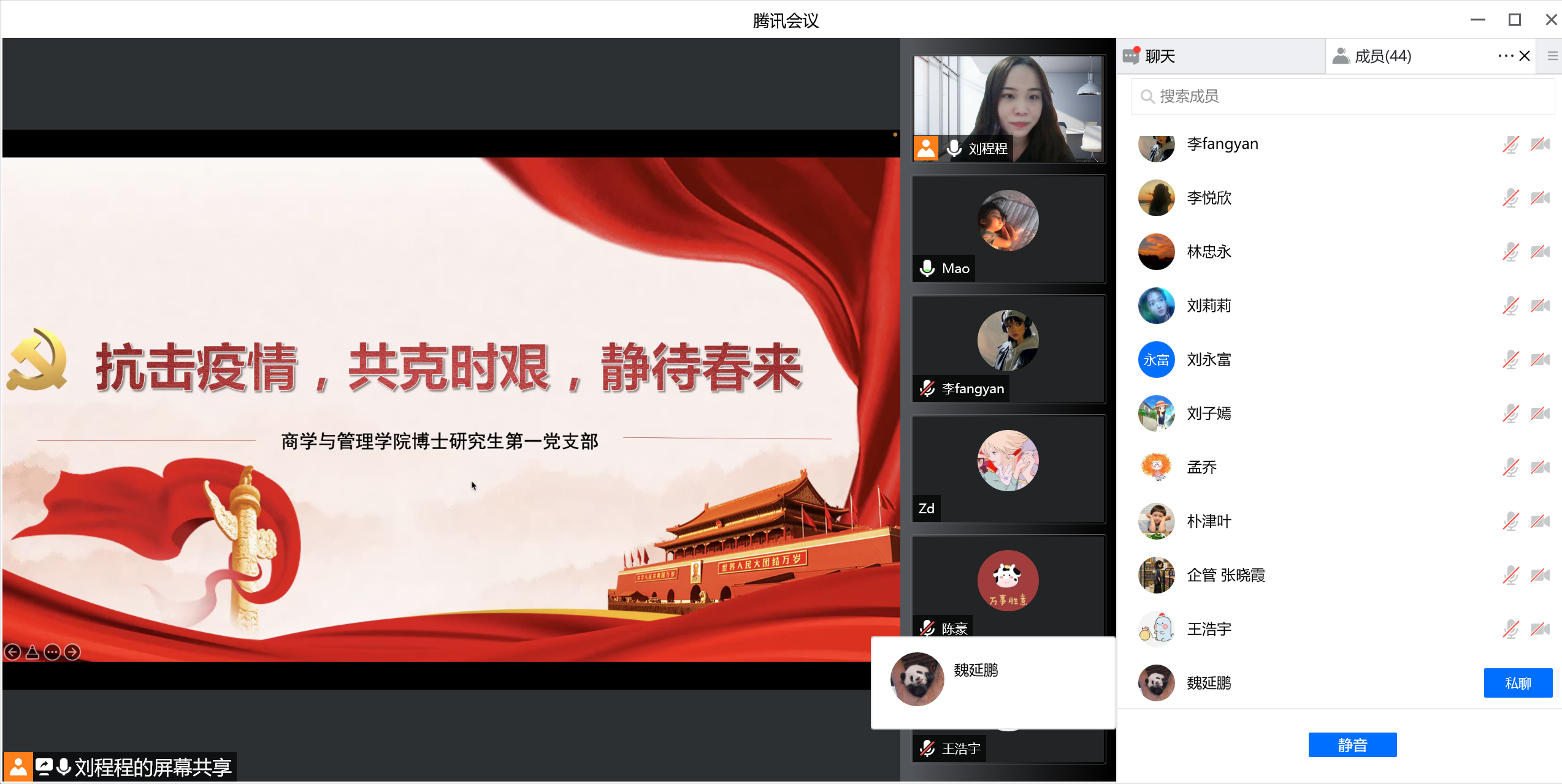 为深入贯彻习近平总书记关于疫情防控工作重要指示批示精神,积极应对当前复杂严峻的疫情防控形势,2022年3月25日,伟德官网博士研究生第一党支部召开“抗击疫情,共克时坚,静待春来”线上主题党日活动。会议由党支部书记刘程程同志主持,刘欣苗同志与谢敬轩同志记录,支部有44名党员和团员共同参加。