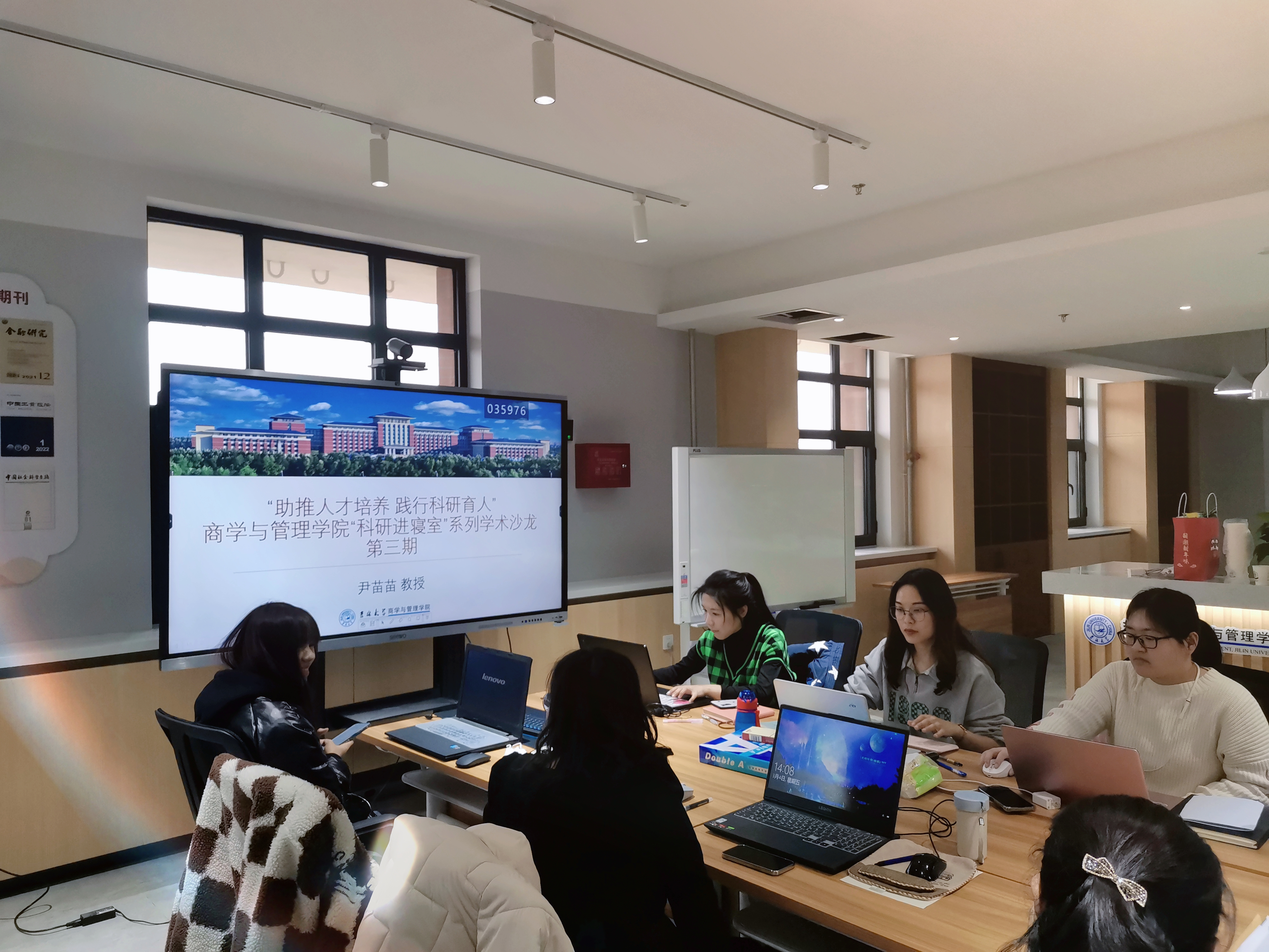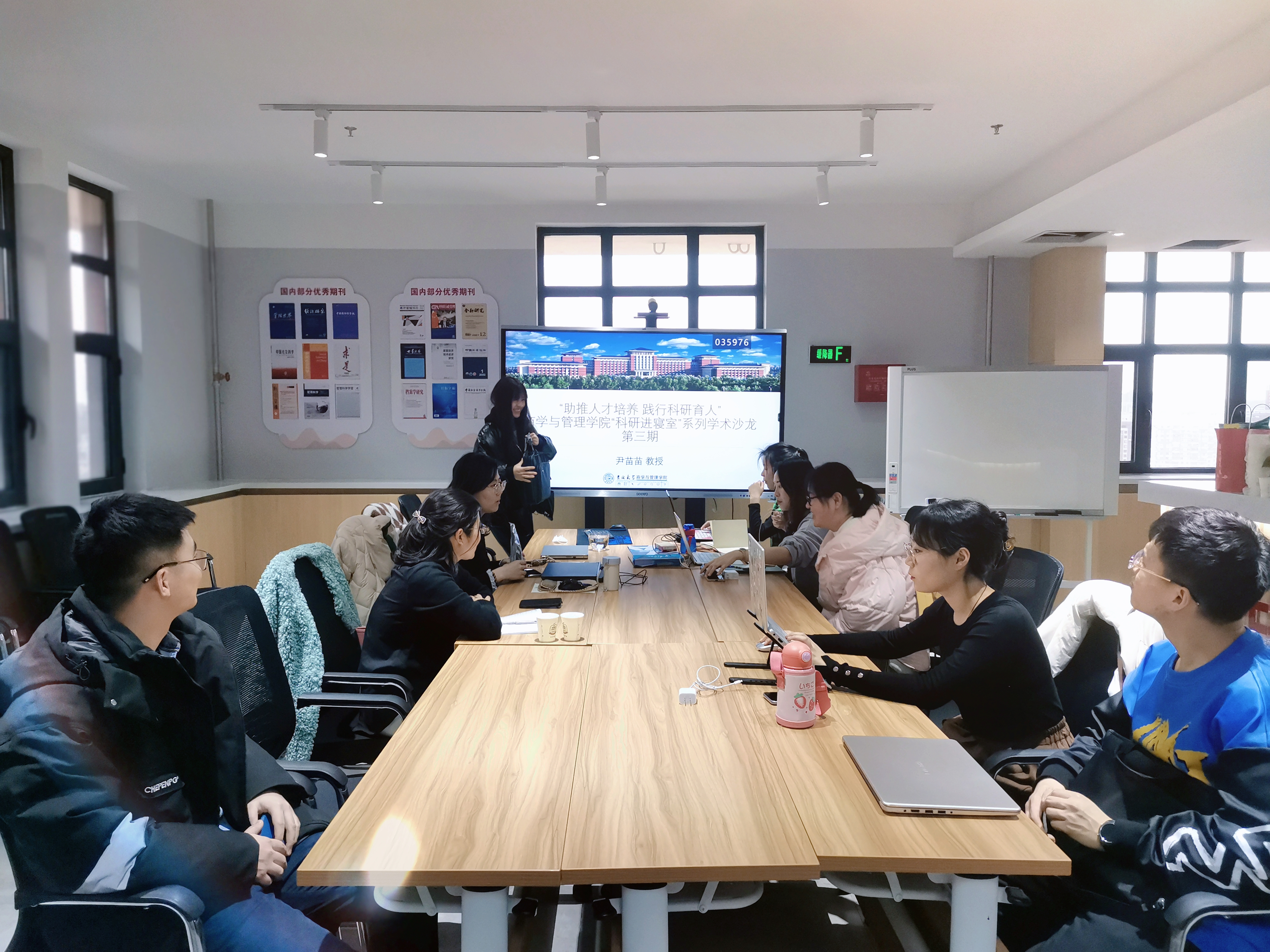在科研育人方面,尹苗苗教授带领其课题组成员围绕“联盟创业”,“用户创业”等学术主题开展了讨论,其指导的2020级硕士研究生和2020级博士生分别分享了硕士论文框架以及学术论文框架,尹苗苗教授及其他参会员工围绕论文提出了学术问题,并研讨出了具体的修改方向。